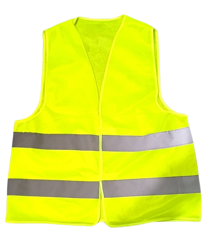 เสื้อจราจรสะท้อนแสง 4 พื้นเสื้อสีเหลืองคอวี คาดแถบรอบตัว 2 แถบ แถบสะท้อนสีเงิน